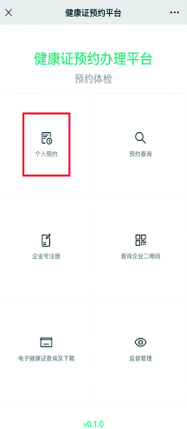 3、进入公众号“预约挂号”后,点击下方的“健康证办理”并选择个人预约。