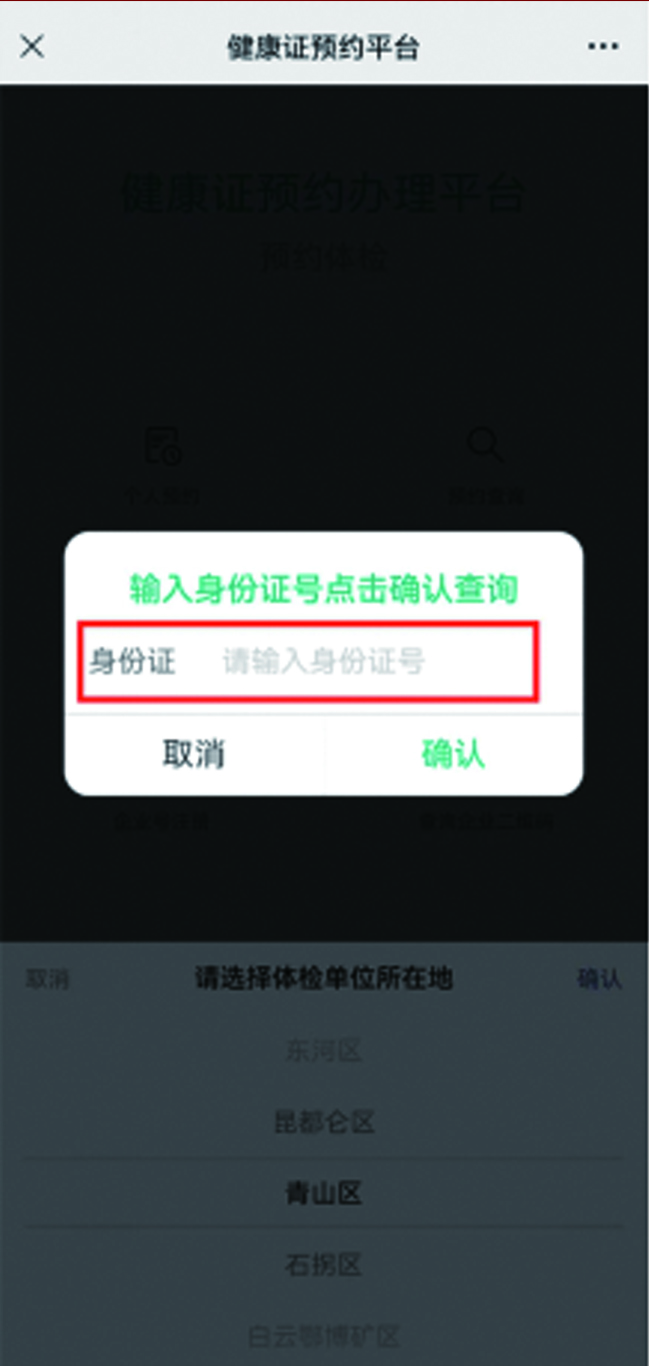 4、进入个人预约页面后,先选择“青山区”,再输入“身份证号码”,预约单位洗择“包头淞雅中医医院“,按要求填写个人信息、预约办理时间并上传照片,信息确认无误后点击“确认预约。